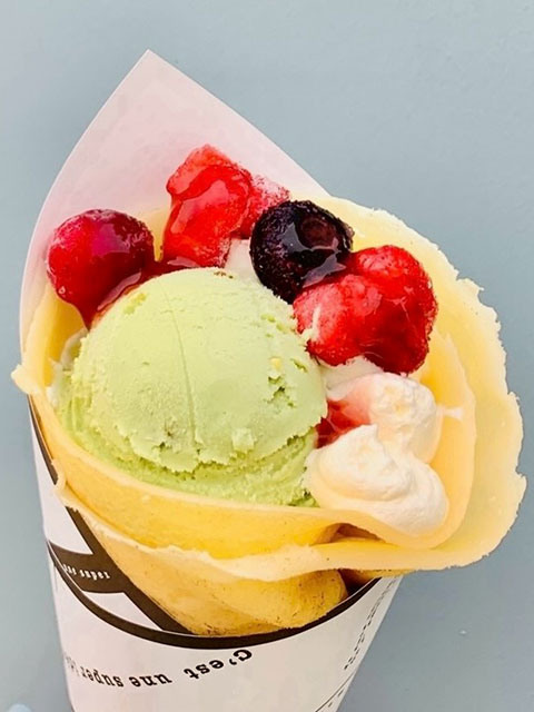 100%純生クリームを使用したクレープです。 ホイップクリームを選ぶこともできます。 クレープ生地には香川県産品小麦の『さぬきの夢』 を使用し、水は一切使わず卵と成分無調整牛乳を 使用した栄養満点で生地だけ食べても美味しい クレープです。 アイスクリームもホテルレストラン仕様の高品質 の物を取り揃えています。