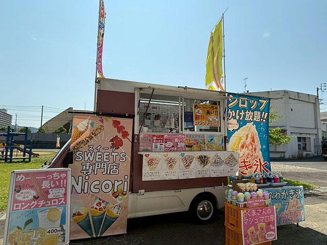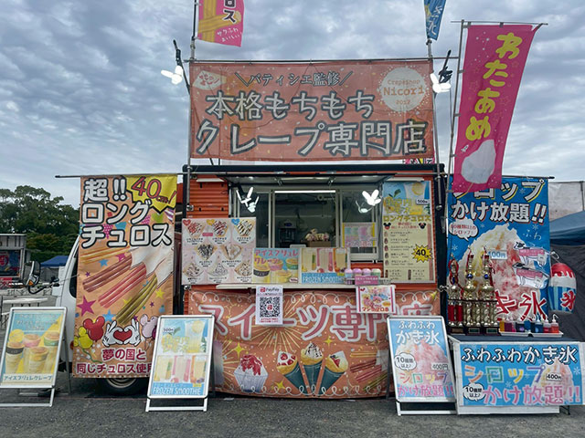 もちもちの生地が特徴のクレープや、40cmロングチュロス・3色カップわたあめなど、子どもから大人まで楽しめるスイーツをご用意しております。大型イベントでキッチンカー部門1位を複数回獲得した実績を持つこだわりのスイーツ専門キッチンカーです!